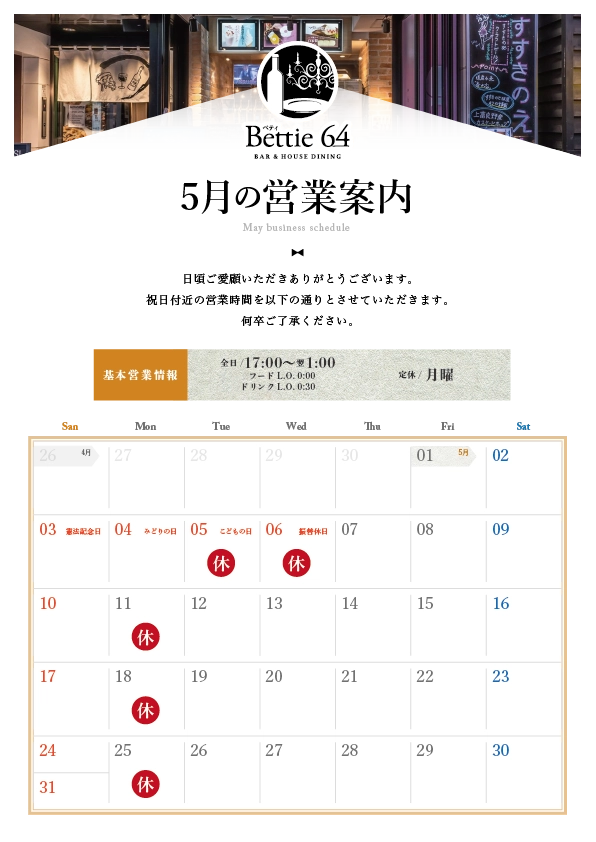 5月5日(火・祝)、6日(水・祝)にお休みをいただきます。