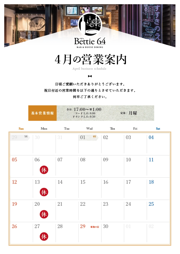 定休日が月曜のため、基本月曜定休させていただきますが、